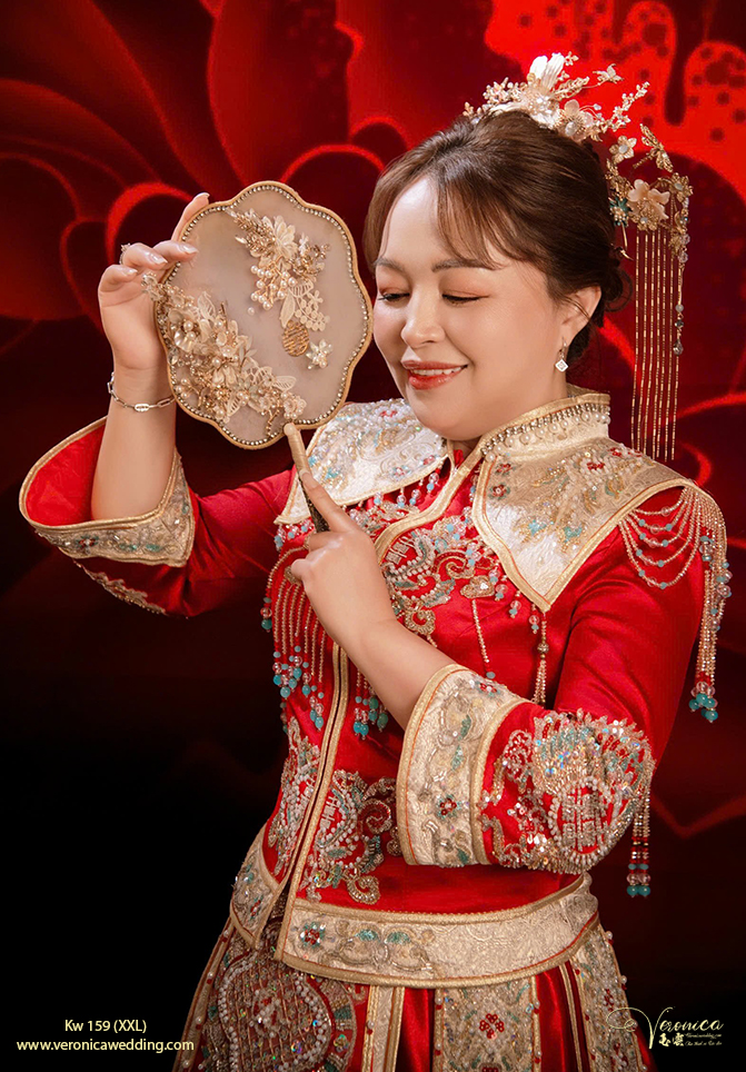 Thiết kế kín đáo, nhã nhặn nhưng vẫn giữ được các chi tiết thêu rồng phụng, hoa văn phú quý – biểu trưng cho tài lộc, hạnh phúc và sự viên mãn trong ngày cưới.Trong lễ cưới truyền thống của người Hoa – đặc biệt tại khu vực Chợ Lớn, không chỉ cô dâu chú rể mới chú trọng trang phục, mà bà sui – mẹ cô dâu chú rể cũng cần được chuẩn bị một bộ trang phục phù hợp, trang nghiêm và mang ý nghĩa may mắn.