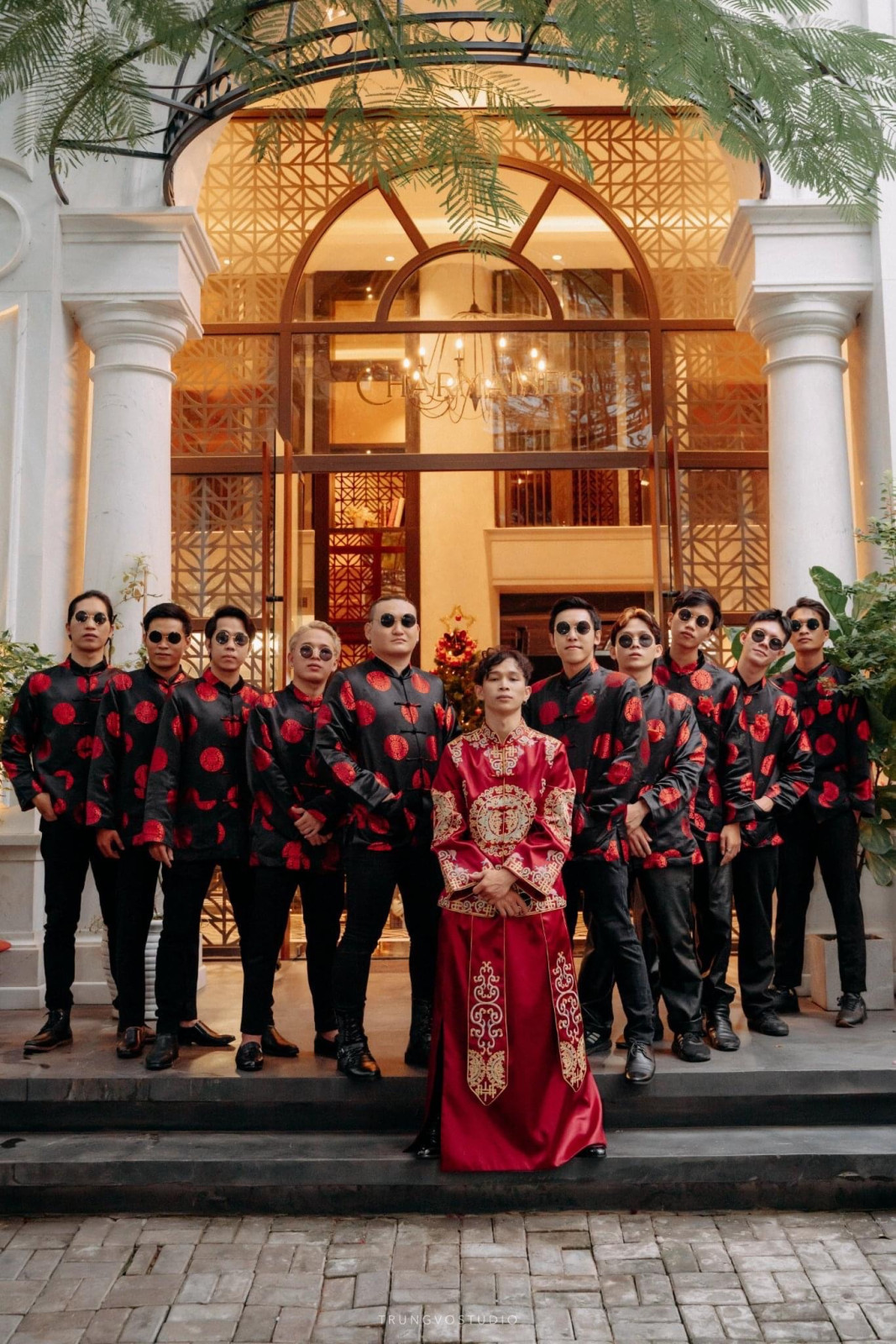 Chiếc áo khỏa nam màu đỏ thêu rồng chỉ vàng tại Veronica Wedding là lựa chọn lý tưởng cho chú rể yêu thích phong cách truyền thống sang trọng. Màu đỏ rực rỡ tượng trưng cho hỷ sự và may mắn, còn hình ảnh rồng thêu chỉ vàng lại mang ý nghĩa quyền lực, vương giả và phúc khí trong hôn nhân.
