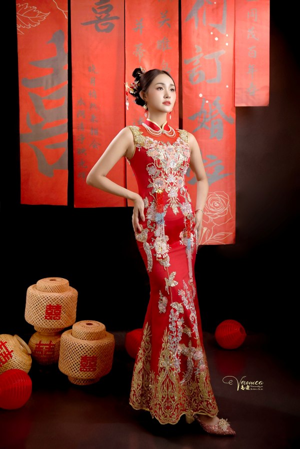 - Phong cách váy nên chọn: Trang phục mang phong cách cổ xưa Trung Hoa mang nét truyền thống xưa và hiện đại tôn lên sự thanh thoát thướt tha. Màu sắc ưu tiên các tông đỏ, vàng hoặc xanh đậm, kết hợp họa tiết thêu rồng, phượng hoặc hoa văn truyền thống để thể hiện nét văn hóa cưới Trung Hoa.