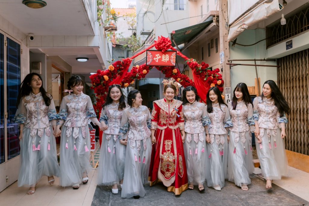 Bên cạnh áo khoả cho mình. Cô dâu đã có được trọn concept trang phục cưới cùng tông. Mang lại vẻ đẹp sang trọng, chỉn chu cho cô dâu chú rể. Sự đồng bộ trong hỷ phục cưới làm tôn nét nổi bật cho nhân vật chính. Cùng dàn bưn quả cũng duyên dáng, độc đáo không kém.