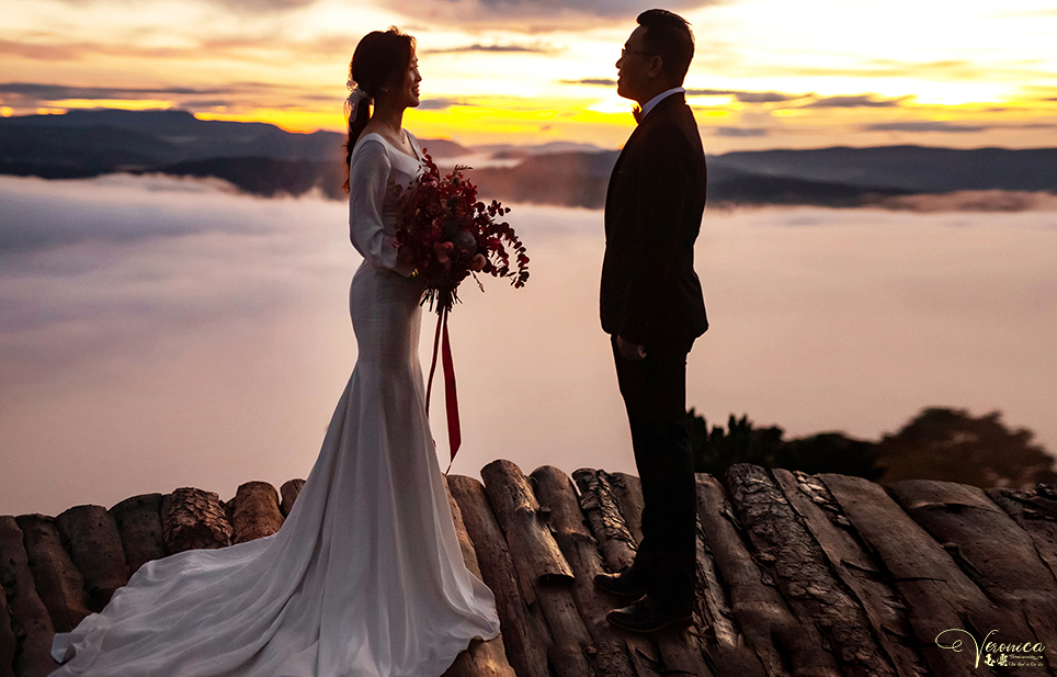 Khác với gói chụp phim trường, những tấm ảnh cưới chụp tại Đà Lạt sẽ mang phong cách tự nhiên hơn. Cảnh mây núi, rừng cây, công trình kiến trúc cổ vừa mang đến những tấm ảnh đẹp, vừa là trải nghiệm trong chuyến đi “du ngoạn” và chụp ảnh cưới của cặp đôi. Cô dâu và chú rể có thể chọn váy cưới soiree trắng, vest với những địa điểm đầy thơ mộng tại Đà Lạt. Cũng có thể chọn những bộ trang phục truyền thống của người Hoa như khoả, sườn xám để tạo nét mới lạ cho bộ ảnh cưới. Ngoài ra, Veronica còn hỗ trợ chụp cho cặp đôi trang phục mà cô dâu chú rể tự chuẩn bị.