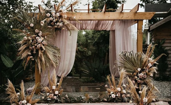 Đem không khí tươi mát, rực rỡ của vùng nhiệt đới vào ngày cưới. Cổng hoa cưới đơn giản phong cách Tropical là lựa chọn hoàn hảo cho tiệc cưới bãi biển hoặc ngoài trời. Thiết kế này sử dụng các loại lá cây bản to và hoa nhiệt đới đầy màu sắc. Một chiếc cổng cưới đơn giản này mang đến vẻ đẹp hoang dã và phóng khoáng.
