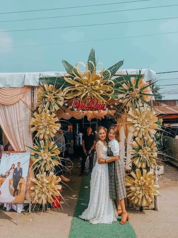 Ngoài ra, vẻ đẹp của cổng hoa cưới đơn giản bằng lá dừa còn nằm ở sự khéo léo của người thợ thủ công, thường do người thân hoặc hàng xóm cùng nhau thực hiện. Họ uốn nắn từng chiếc lá để tạo nên những hình thù tinh xảo, uyển chuyển như hình vòm, trái tim, hoặc kết hình rồng phụng đầy công phu. Ngoài lá dừa, gia đình có thể điểm thêm hoa cau, hoa trầu hay một vài bông vạn thọ, đồng tiền để tăng thêm sự duyên dáng.