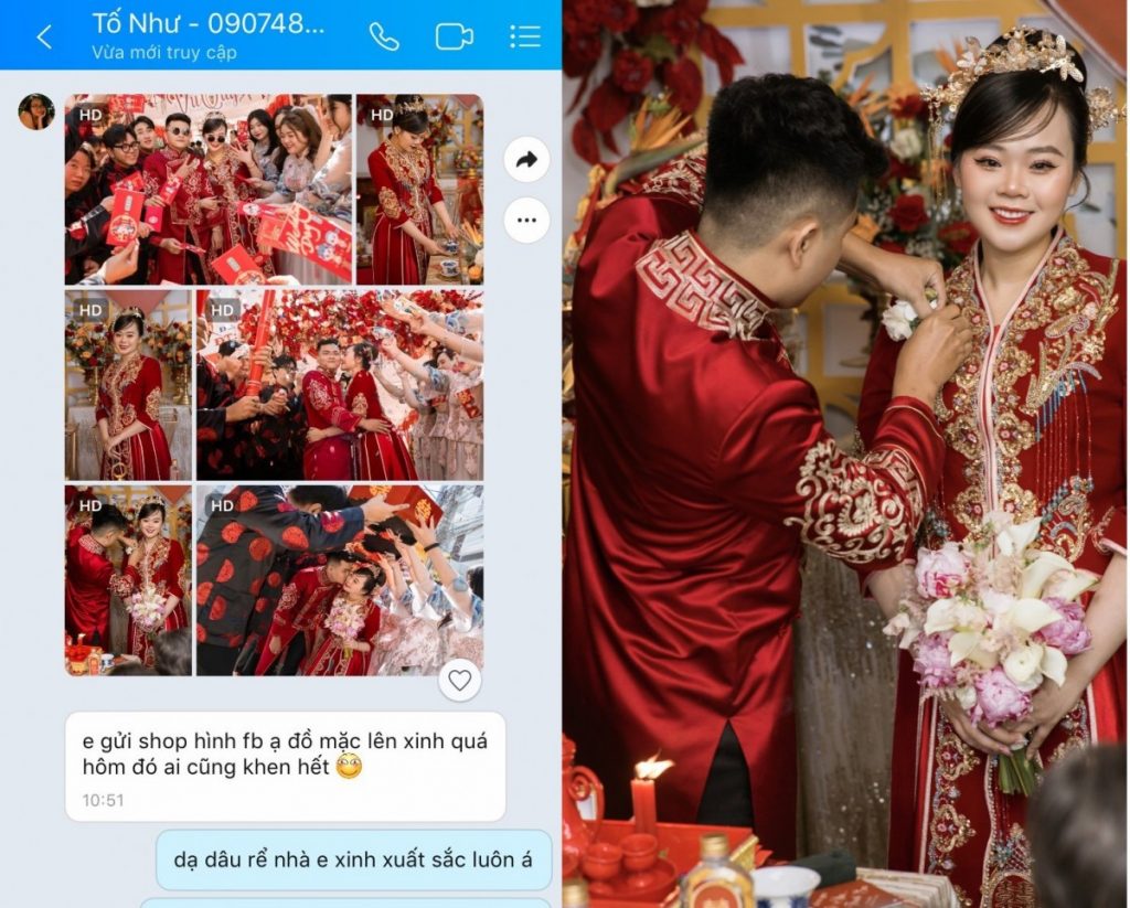 Là một cô dâu người Hoa, khi bắt đầu có kế hoạch đám cưới. Chắc chắn bạn sẽ tham khảo nhiều nơi cho thuê áo khoả. Đó có thể là từ bạn bè, người thân hoặc tìm thông tin trên các trang mạng xã hội, nhóm cô dâu sắp cưới… Cùng tâm thế ấy, cô dâu Tố Như cũng tìm hiểu nhiều nguồn thông tin trước khi đưa ra quyết định. Nàng dâu vô tình thấy những hình ảnh chụp cưới của Veronica Wedding trên facebook, và sau đó cô nàng đã tin tưởng chọn cặp áo khoả dâu rể, cùng với trọn bộ trang phục bưng quả cho nhà trai và nhà gái, trong ngày trọng đại của mình.