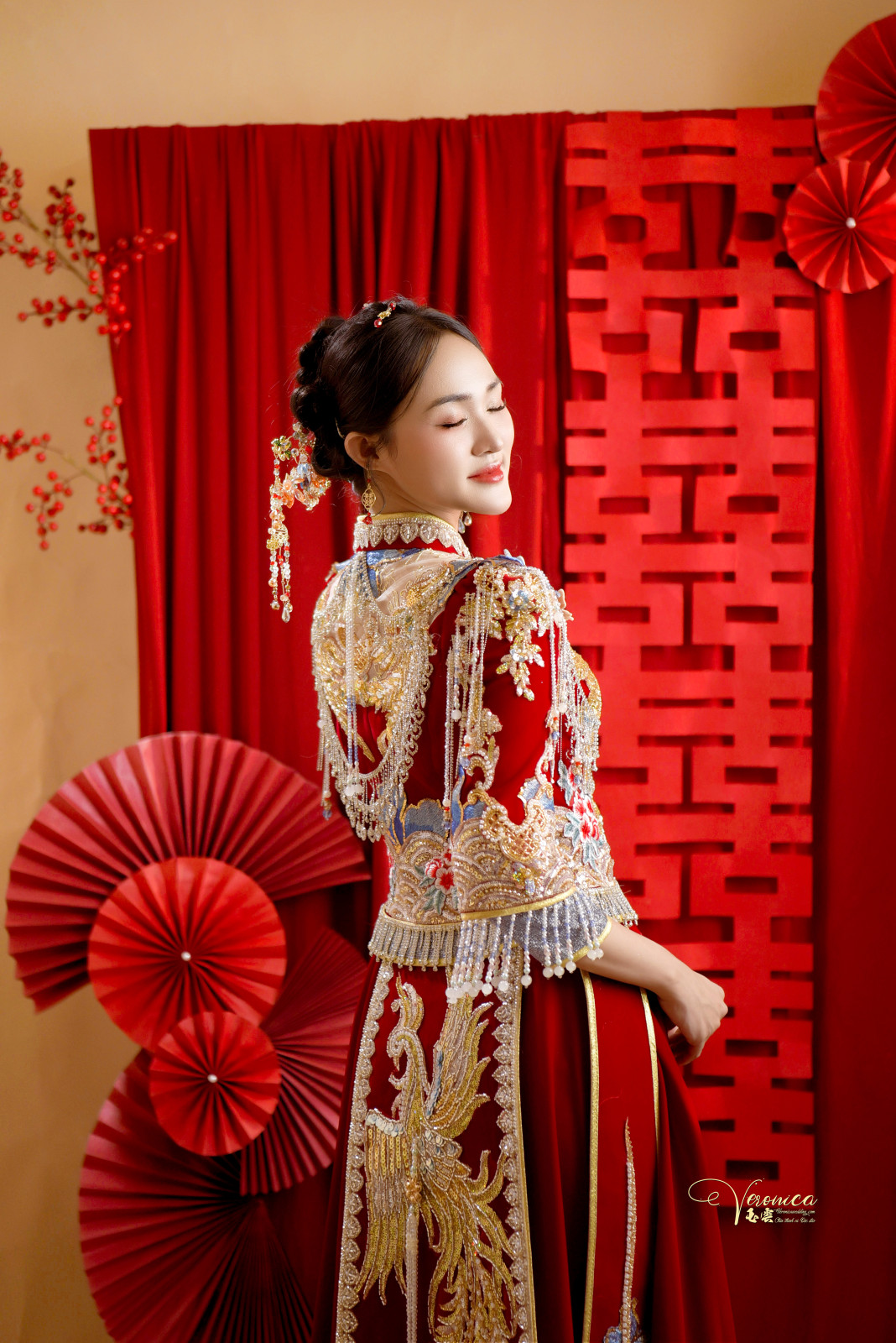 Trong chiếc áo khoả màu đỏ tươi, hoạ tiết màu xanh thanh nhã, cô dâu sẽ có những trải nghiệm và cảm xúc vô cùng đặc biệt. Bởi màu sắc không chỉ mang lại sự lạ mắt, mà kiểu dáng của hoạ tiết cũng góp phần tạo nên sức hút đặc biệt.