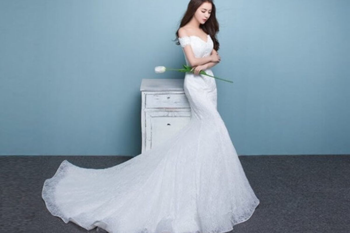 Đầm cưới đuôi cá trễ vai không chỉ khoe trọn bờ vai quyến rũ của cô dâu và còn che đi khuyết điểm cho các nàng dâu có bắp tay to mà muốn mặc soiree đuôi cá trong ngày trọng đại. Bên cạnh đó, với các nàng dâu có kích thước vòng 1 nhỏ thì soiree trễ vai sẽ tạo cảm giác vòng 1 trở nên đầy đặn hơn.